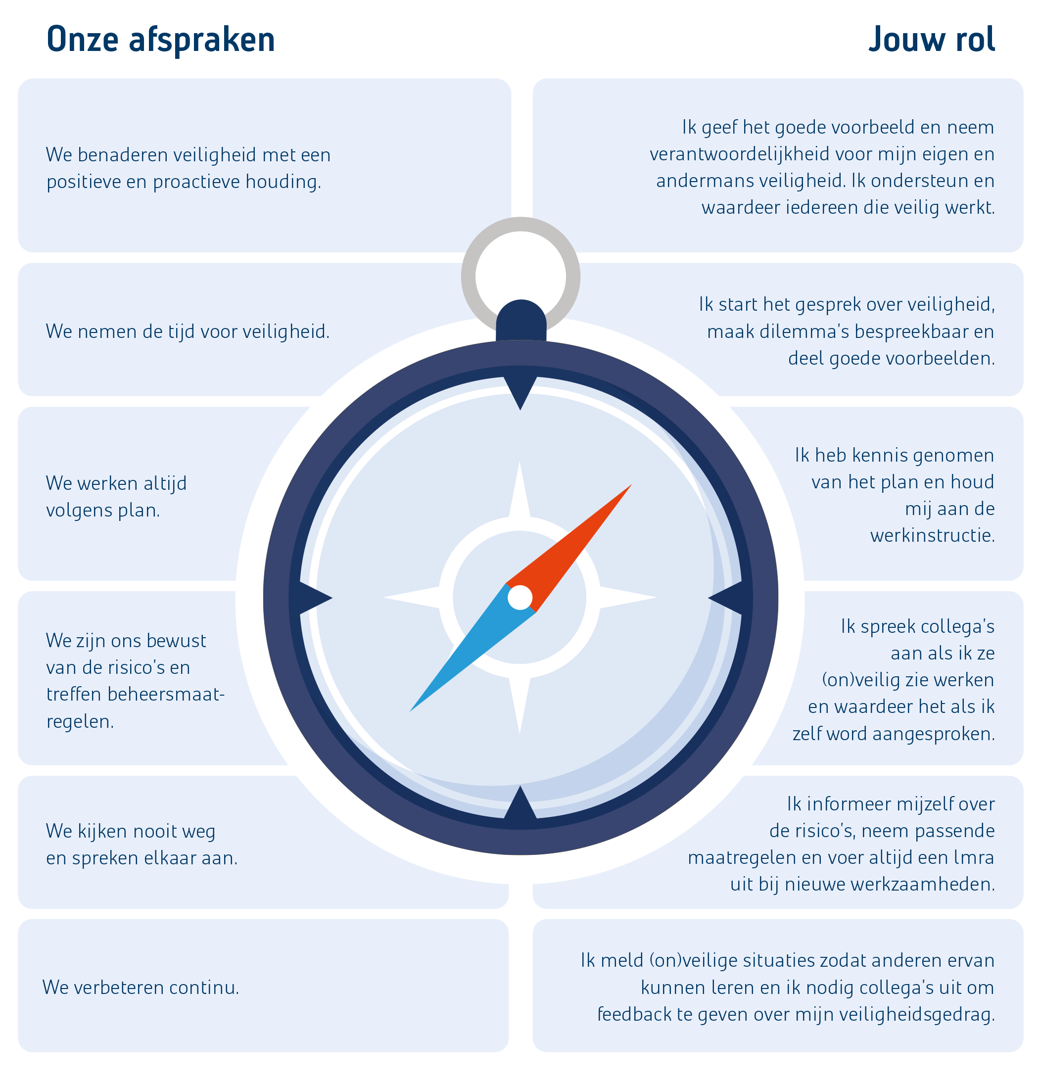 Misschien vanzelfsprekend, maar veiliger werken begint bij jezelf. We verwachten van je dat je je houdt aan de regels en richtlijnen in onder meer dit boekje. En dat je indien nodig zelf actief op zoek gaat naar aanvullende informatie om veilig te werken. Maar ook dat je je collega's aanspreekt op onveilig gedrag. Of je nu werkt op een bouwplaats of op kantoor: houd je aan de afspraken uit het GO! kompas (klik voor meer informatie).